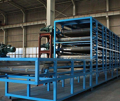 將物料均勻的平鋪在網(wǎng)帶上,網(wǎng)帶采用12-60目的鋼絲網(wǎng)帶,由傳動(dòng)裝置拖動(dòng)在干燥機(jī)內(nèi)往返移動(dòng),熱風(fēng)在物料間穿流而過,水蒸氣從排濕孔中排出,從而達(dá)到干燥的目的,箱體長(zhǎng)度由標(biāo)準(zhǔn)段組合而成,為了節(jié)約烘干場(chǎng)地,可將烘干機(jī)制成多層式,常見的有二室三層、二室五層、長(zhǎng)度6-80m,有效寬度0.6-3.0m。